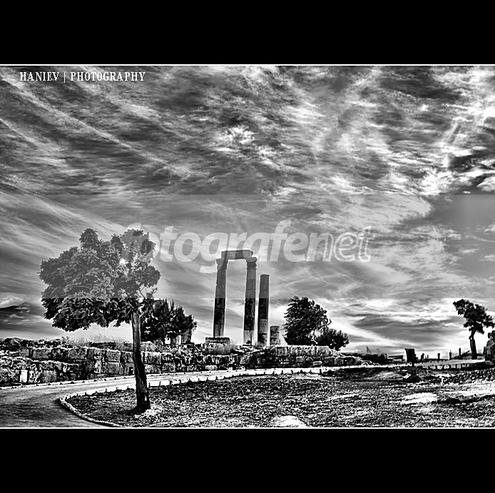 Temple of HerculesrnrnCitadel, Amman, Jordan Benteng, Amman, YordaniarnrnCandi besar Hercules (Herakles) dibangun antara 162-166 AD. Lebih besar daripada Bait Suci di Roma itu sendiri, struktur besar menghadap ke timur dan terlihat di sini dari depan (sudut timur laut kolom.) Candi serambi ini dibingkai dengan tinggi 33 kaki enam. Tidak adanya kolom pada seluruh struktur, telah meyakinkan excavator bahwa candi itu benar-benar pergi yang belum selesai.Sebuah model candi ditampilkan di ACOR, Pusat Amerika untuk Penelitian Oriental di Amman.