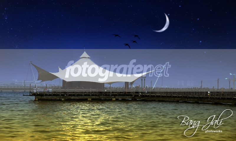 komposisinya bagus (bulan, burung, warna langit dan warna airnya, juga back ground gedung2nya yang samar2) wooww..