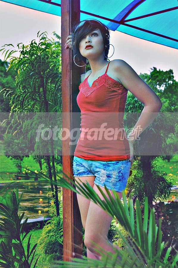 Pose model yg lumayan, dedaunan nampak menggangu juga atap plastik , foto jadi nampak terlalu rame.