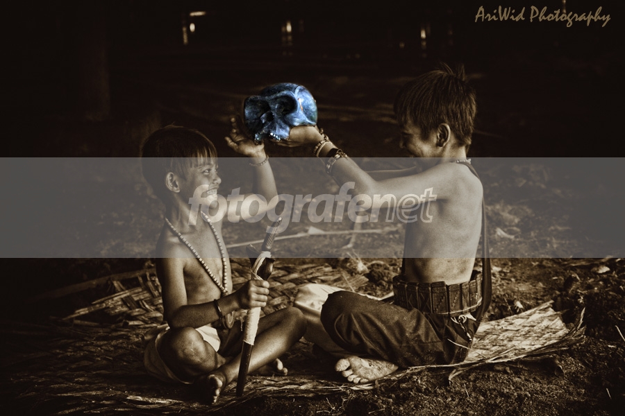 Anak-anak Dayak Losarang sedang bermain tengkorak manusia (asli) yang telah menjadi fosilnnDate Time Original: 2011:04:02 14:34:29nISO Speed Ratings: 640