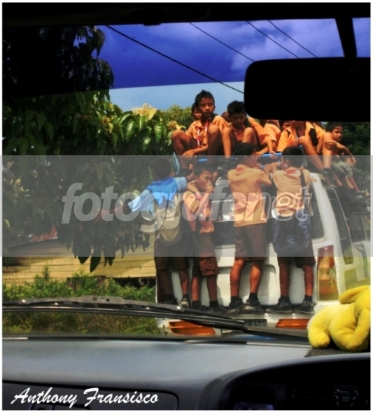 diambil 7 february 2010 di pulau samosir, sumater utara.rnanak-anak sd yang akan pulang kerumah menggunakan mobil angkutan umum