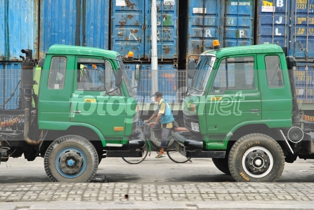 Seorang pengojek sepeda melintas diantara truk kontainer pengangkut peti kemas yang tengah parkir di Pelabuhan Sunda Kelapa, Jakarta.