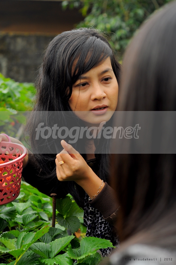 Suatu hari di kebun stroberi. Sales Dadakan,"bapak ibu ini stroberinya sangat berkualitas, dan memiliki taste yang luar biasa dr stroberi yg lainnya. boleh di coba." *KENYATAANNYA:INI FOTO GAK SENGAJA SAYA AMBIL. PADA SAAT ITU MBAK YANG INISIALNYA "D" INI LAGI NGOBROL DENGAN YANG PUNYA KEBUN. TP EKSPRESINYA BAGAIKAN SALES YANG MEYAKINKAN PELANGGAN*