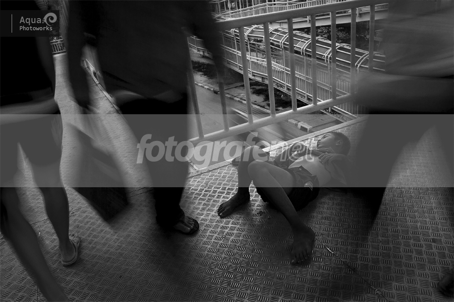 Somehow this boy caught my attention. This bridge connects to the bus stop I departed. I saw the boy slept when I arrive at the morning on a trip to do Street Photography. So, after done my trip and taking photos, I got off and return by this bridge again; the boy was still there. Then I postponed my return a bit, I drew out my tripod and took some photo of this boy and people passing by. Their attention were more to me with my tripod than to the laying boy. Ah Btw, this is multiple exposure Photo. (Wahhh, FPE 17 Juni 2012, Thanks God, thank you all)