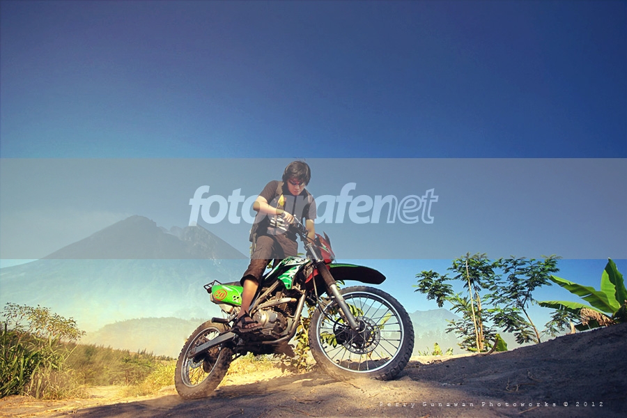 Suka saja liat angle-nya..meski aksinya masih kurang greget..terbantu dengan birunya langit dan puncak Merapi yang justru menjadi perhatian saya daripada pengendara motornya.. :)