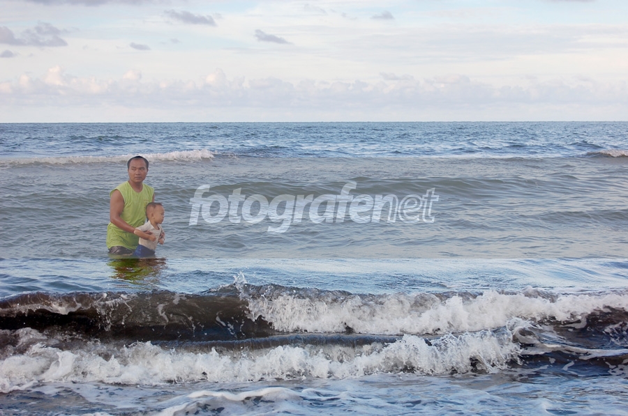 seorang ayah yang menjaga anaknya untuk tidak terlalu jauh darinya saat bermain di air