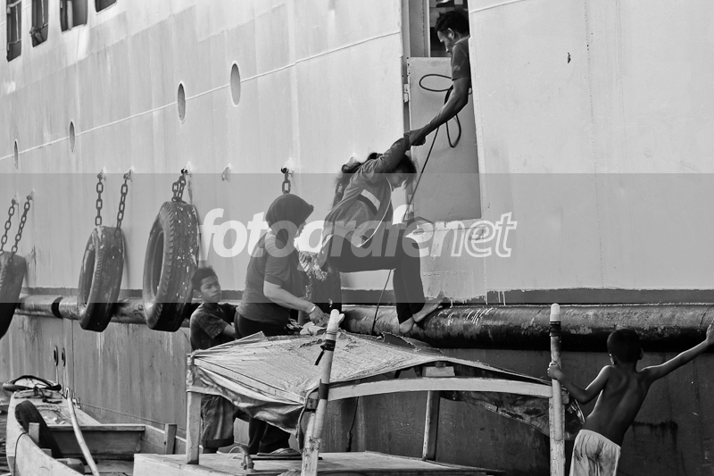 Tidak peduli pengawasan petugas,tidak kawatir keselamatan diri.Dua orang wanita mencoba menaiki kapal Feri,demi menghindari antrian.