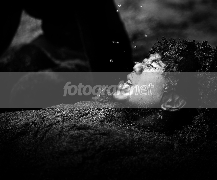 model ditanam dalam pasir hingga tampak wajah saja, kemudian di teteskan air. di buat bw. tq
