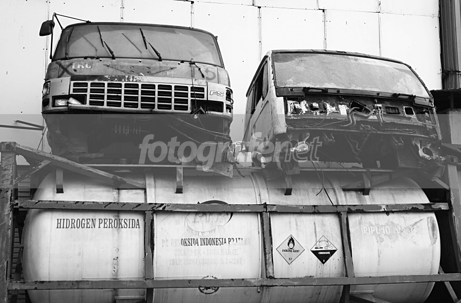 Onggokan kepala truk yang rusak dengan tabung Hidrogen Peroksida di bawahnya, seakan mengingatkan kita efek dari zat kimia ini