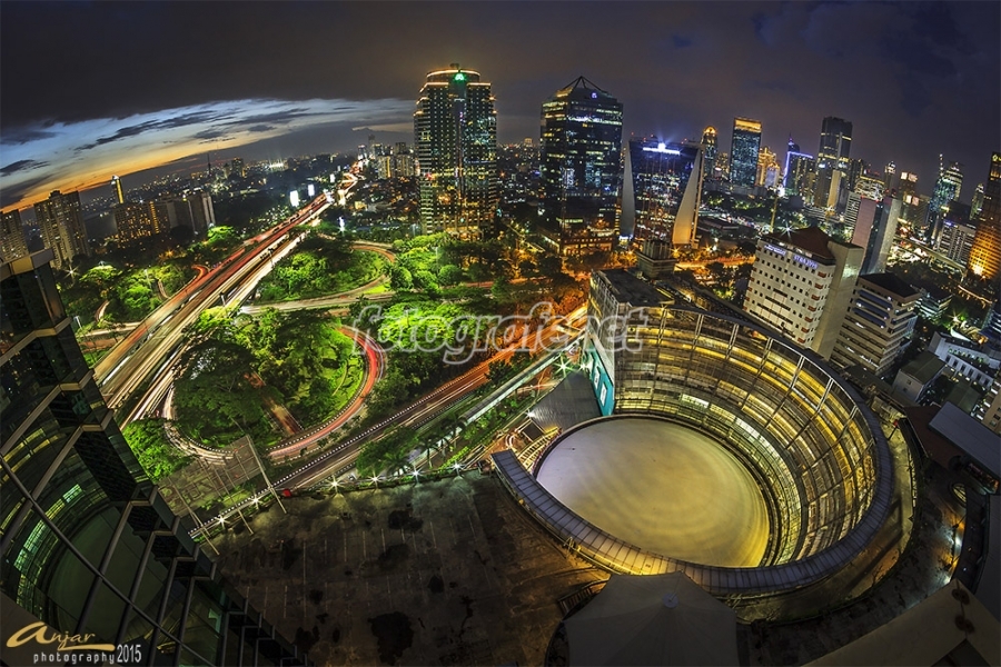 View Jembatan Semanggi & gedung Balai Sarbini, Jakarta di saat sore menjelang malam hari yang membentuk huruf "BP" ditembak dari roof top gedung Veteran Lt.18, Semanggi Plaza.