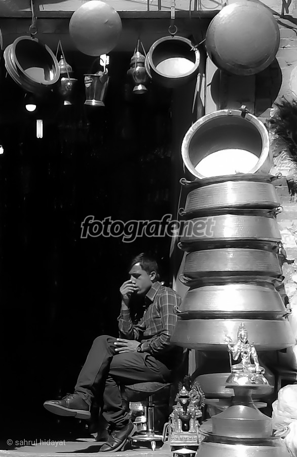 Store keeper in Thamel market, Kathmandu waiting customer.