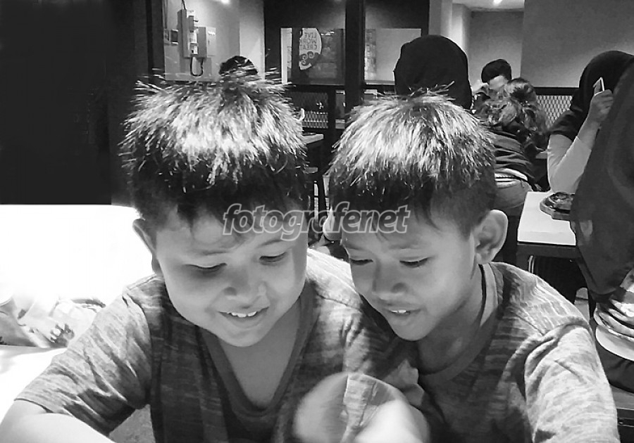 Dua bocah laki laki sedang asik melihat sesuatu yang membuatnya tersenyum